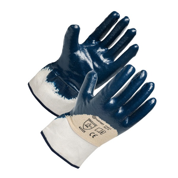 Poids lourd revêtu. Jersey doublé. Couleur bleue. Pas d'allergènes au latex. Le nitrile revêtu remplace efficacement le coton dans une large gamme d'applications sèches et légères.